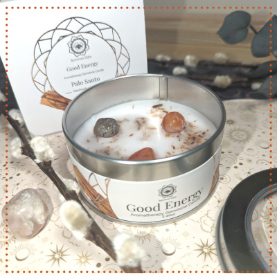 La bougie "Énergie Positive" au palo santo, enrichie d'une pierre de cornaline,...