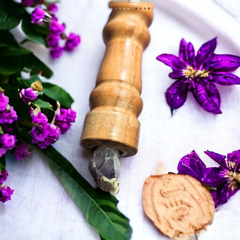 Une baguette de soin, façonnée à partir de l'essence noble du chêne et enrichie par deux minéraux d'améthyste d'Auvergne, incarne une fusion puissante entre la nature et la spiritualité. L'améthyste, pierre d'humilité et de sagesse, est réputée pour stimuler la créativité, l'imagination et apporter clarté d'esprit.