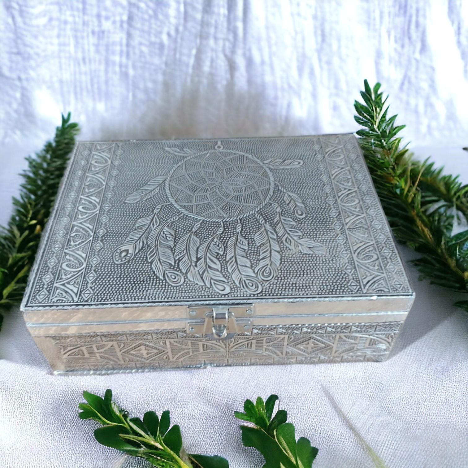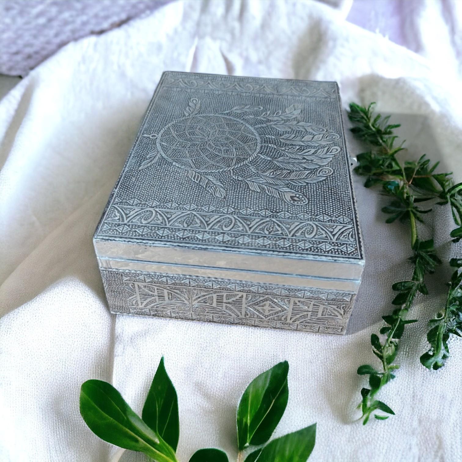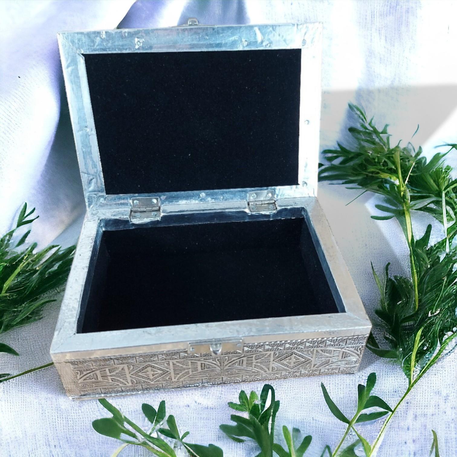 Cette très belle boîte est l'accessoire parfait pour ceux qui souhaitent ranger leurs tarots, minéraux et petits objets de rituel loin des regards indiscrets. Fabriquée avec soin, elle est constituée d'une structure en bois robuste, recouverte de feuilles d'aluminium gaufrées qui lui confèrent une allure unique et protectrice.