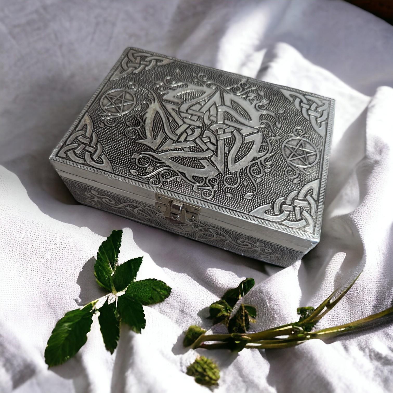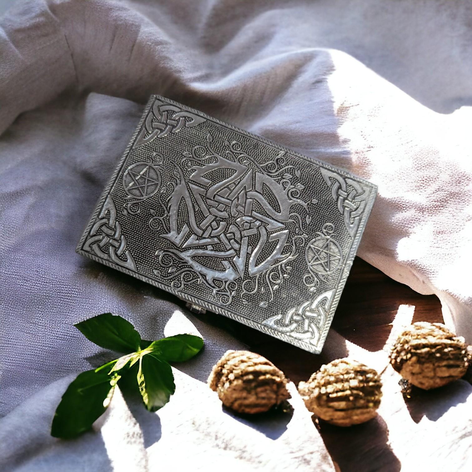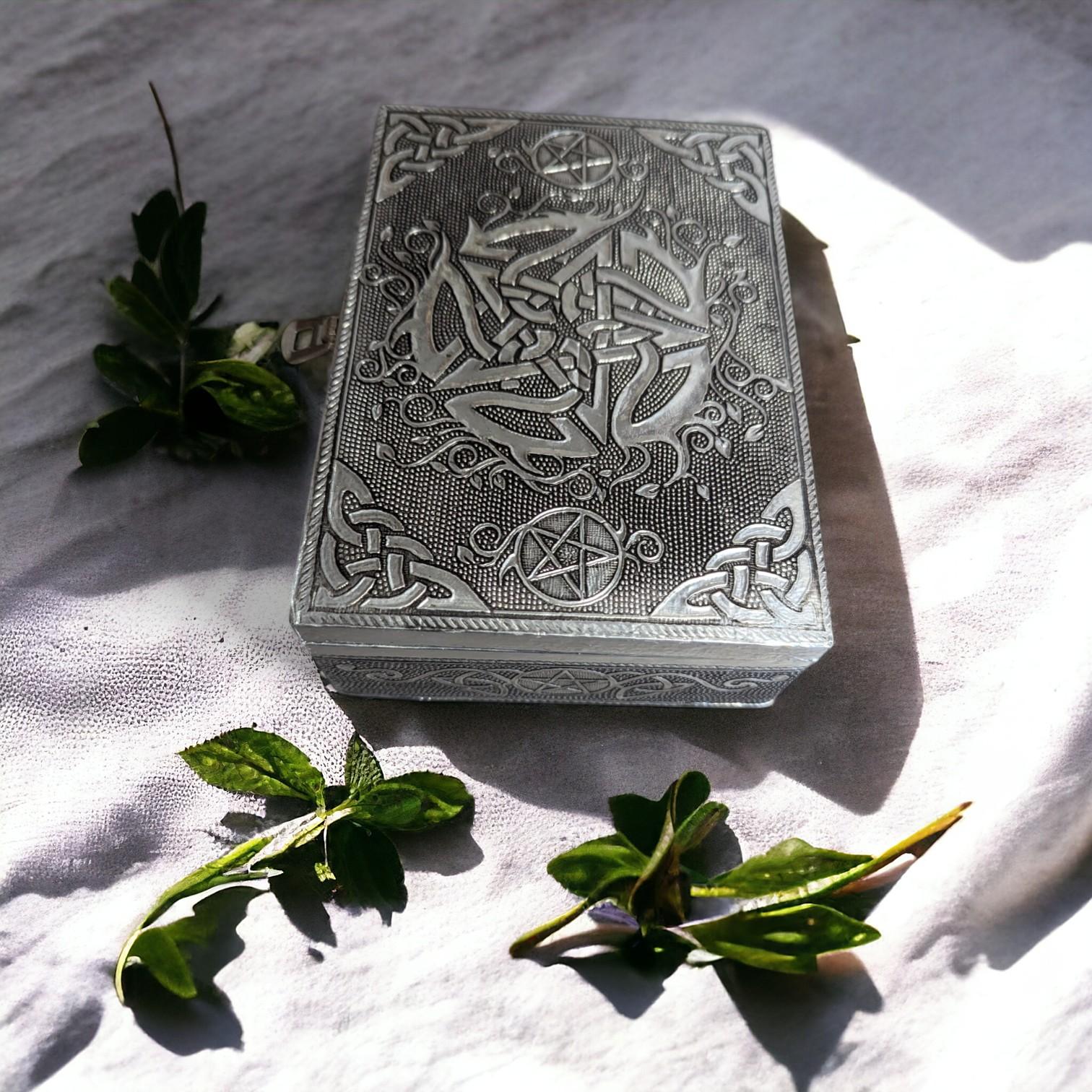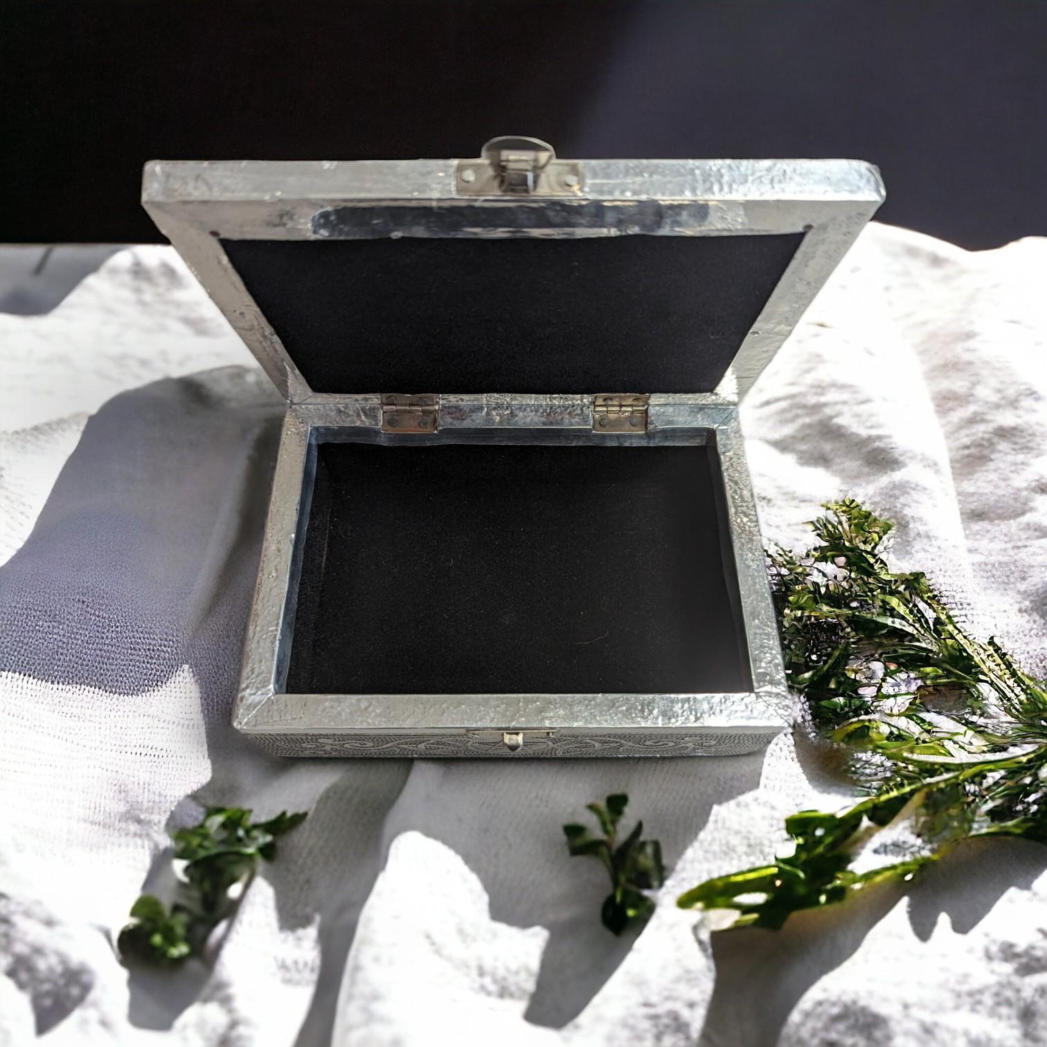 Cette très belle boîte est l'accessoire parfait pour ceux qui souhaitent ranger leurs tarots, minéraux et petits objets de rituel loin des regards indiscrets. Fabriquée avec soin, elle est constituée d'une structure en bois robuste, recouverte de feuilles d'aluminium gaufrées qui lui confèrent une allure unique et protectrice.