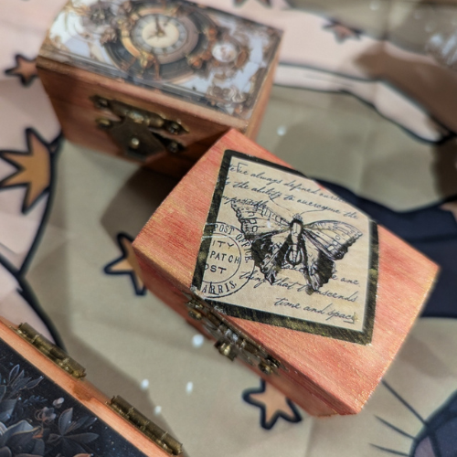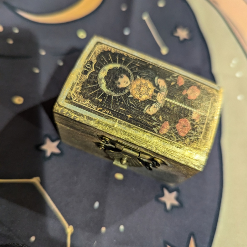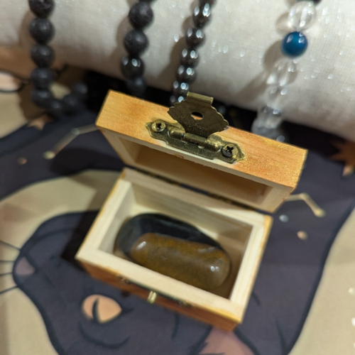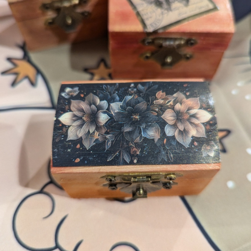 Le fermoir, conçu en laiton, ajoute une touche d'élégance et d'authenticité, rappelant les coffrets d'antan utilisés pour garder précieusement des objets de valeur ou des secrets. Parfait pour agrémenter un autel, ce coffret ne manquera pas d'attirer le regard et de susciter l'intérêt. Son allure vintage et sa construction soignée en font un objet à la fois pratique et esthétiquement plaisant, idéal pour ceux qui chérissent les pièces uniques et chargées d'histoire.