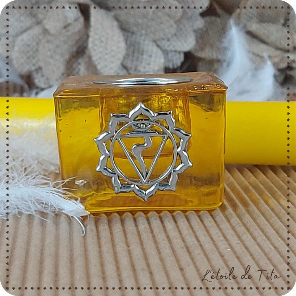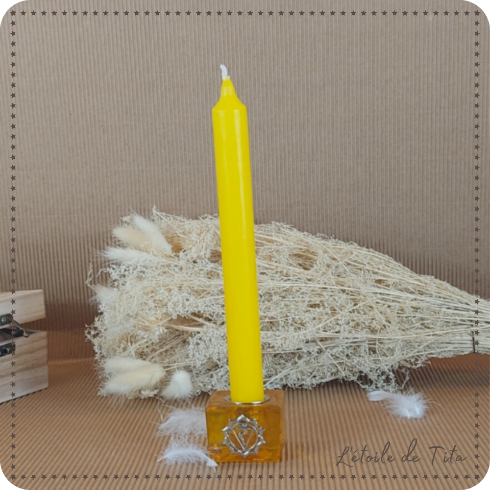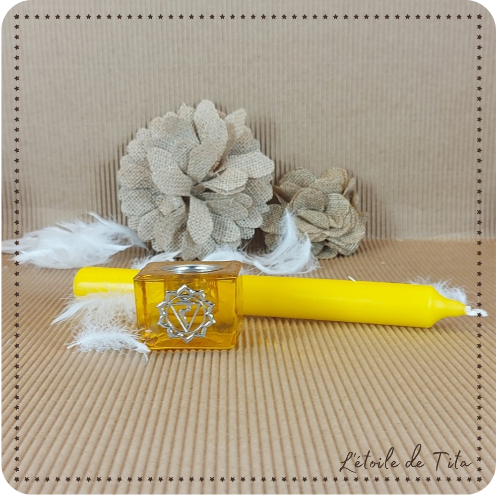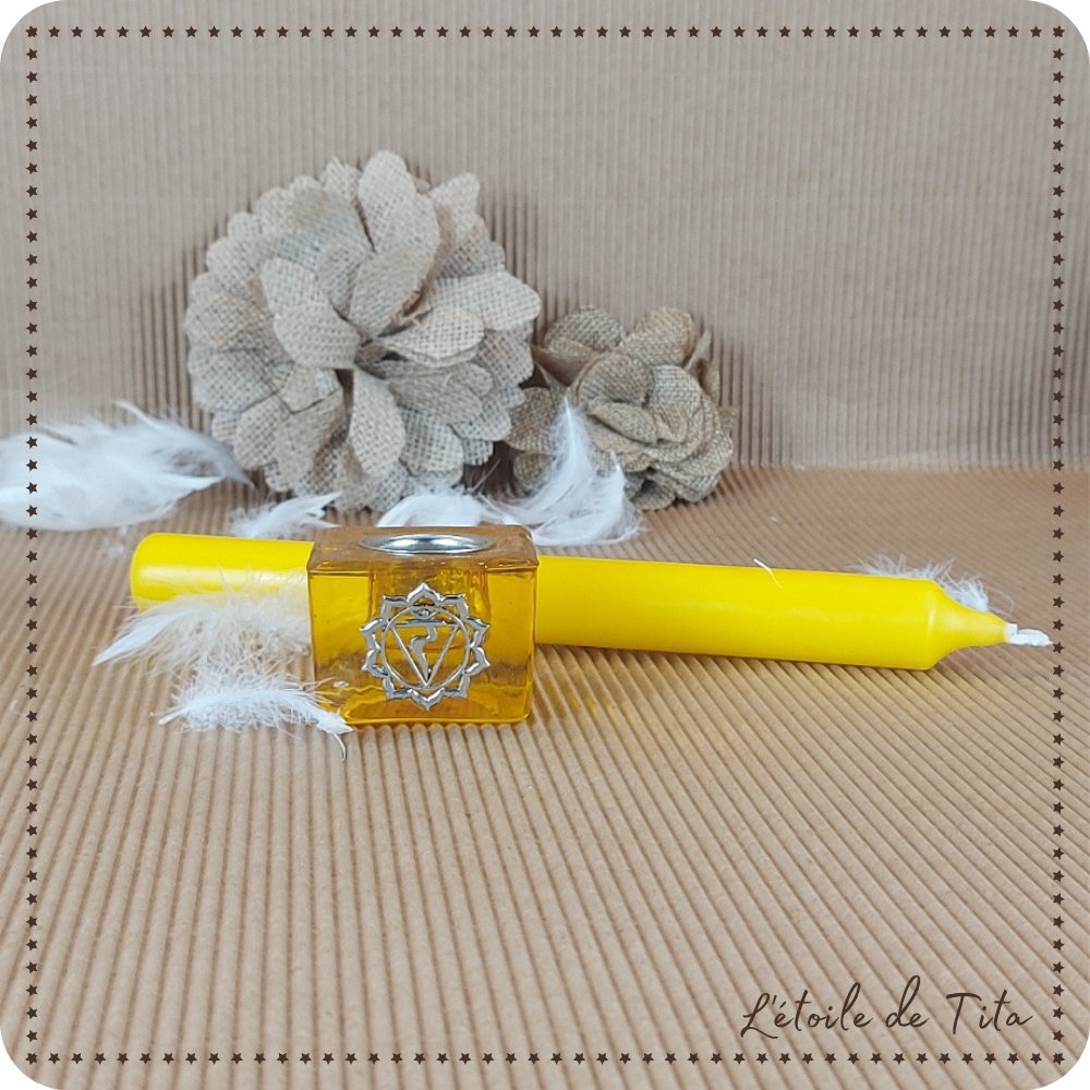Travaillez votre confiance en vous avec ce joli bougeoir jaune solaire correspondant au chakra plexus.