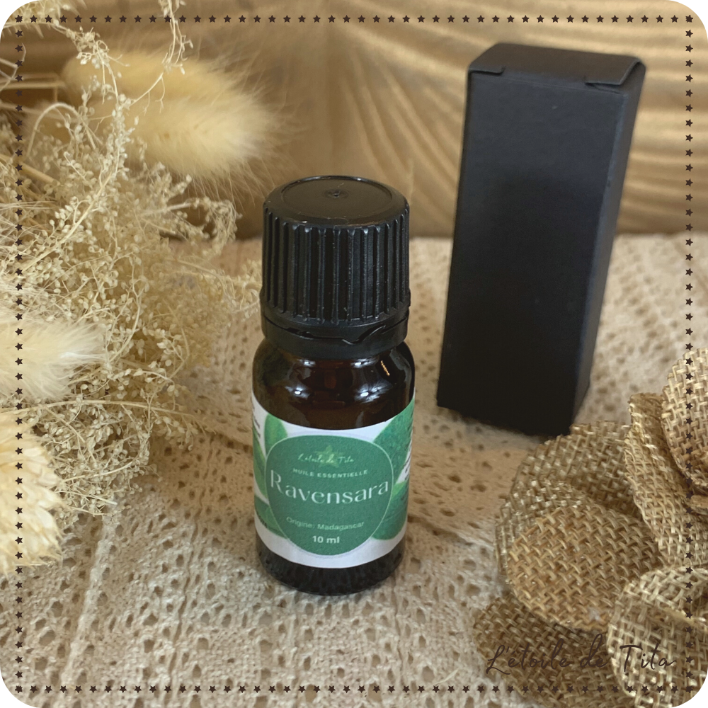 - Immunostimulant + : grâce à ses nombreux constituants, l'huile essentielle de Ravensare est immunostimulante par des mécanismes très variés. Toutefois, elle agira sur le terrain et non sur les symptômes, et le Ravintsara sera meilleur pour cette indication.