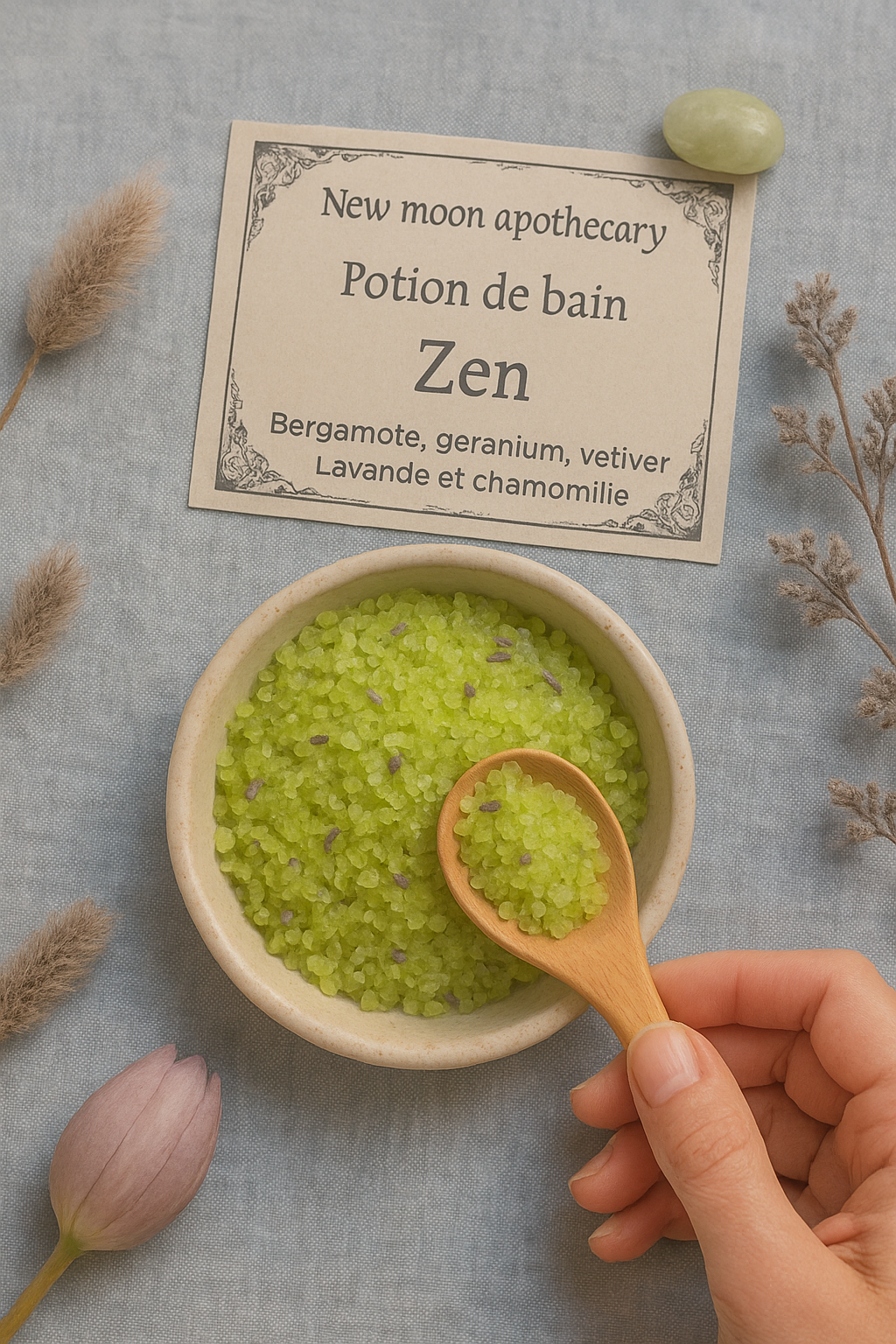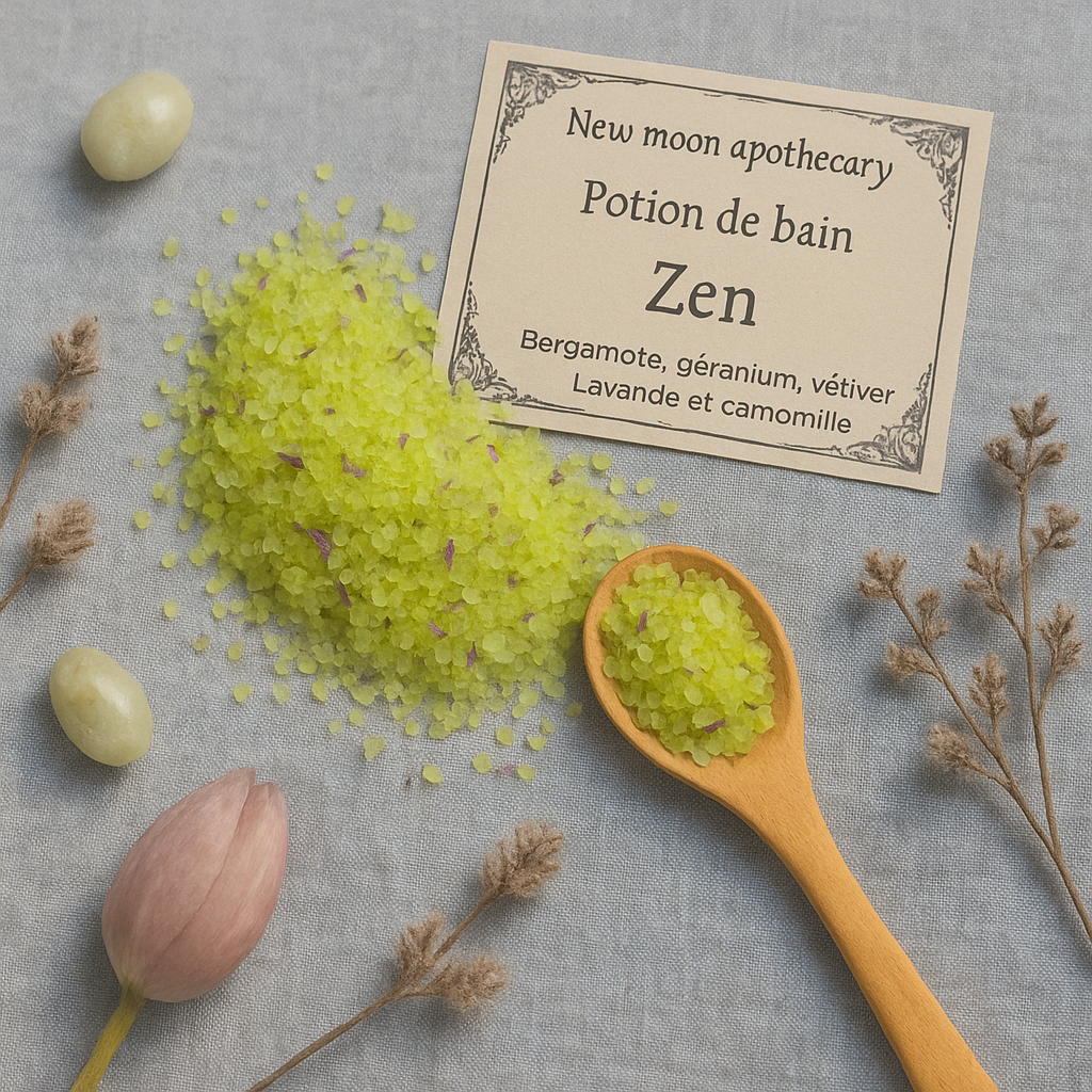 Découvrez la Potion de Bain au sel de mer « Zen », confectionnée artisanalement pour vous offrir une expérience spirituelle unique de relaxation profonde et d'équilibre énergétique. Cette potion magique combine avec délicatesse les pouvoirs apaisants et harmonisants des huiles essentielles pures de géranium, lavande, bergamote et vétiver.