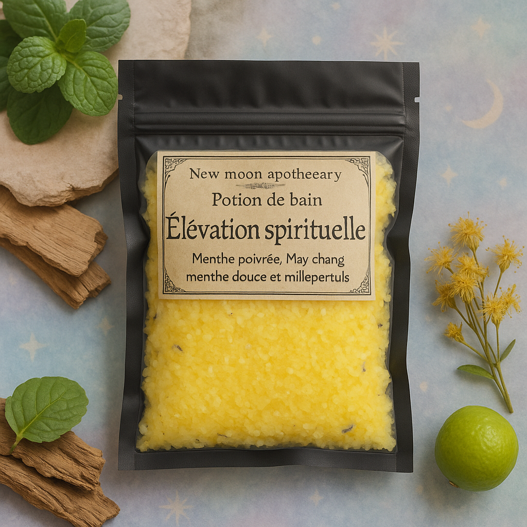 Découvrez la Potion de Bain au sel de mer, alliance magique des huiles essentielles de May Chang, Menthe douce, Millepertuis et Menthe poivrée. Ce mélange artisanal purifie l'aura, libère les énergies stagnantes et favorise un profond renouveau énergétique. Offrez-vous ce soin végétal et mystique, pour un esprit revitalisé, clair et protégé.