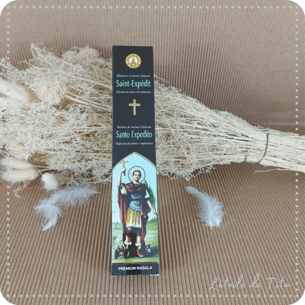 Saint Expédit dénoue les affaires embrouillées, aide à gagner les procès douteux et accélère les dénouements qui tardent à se concrétiser. Encens Saint Expédit, utilisé pour les causes urgentes, annule la négativité et attire le positif, la vie, influence l'être aimé, favorable dans les causes pressées. Aide également à améliorer les résultats scolaires et lors des examens.