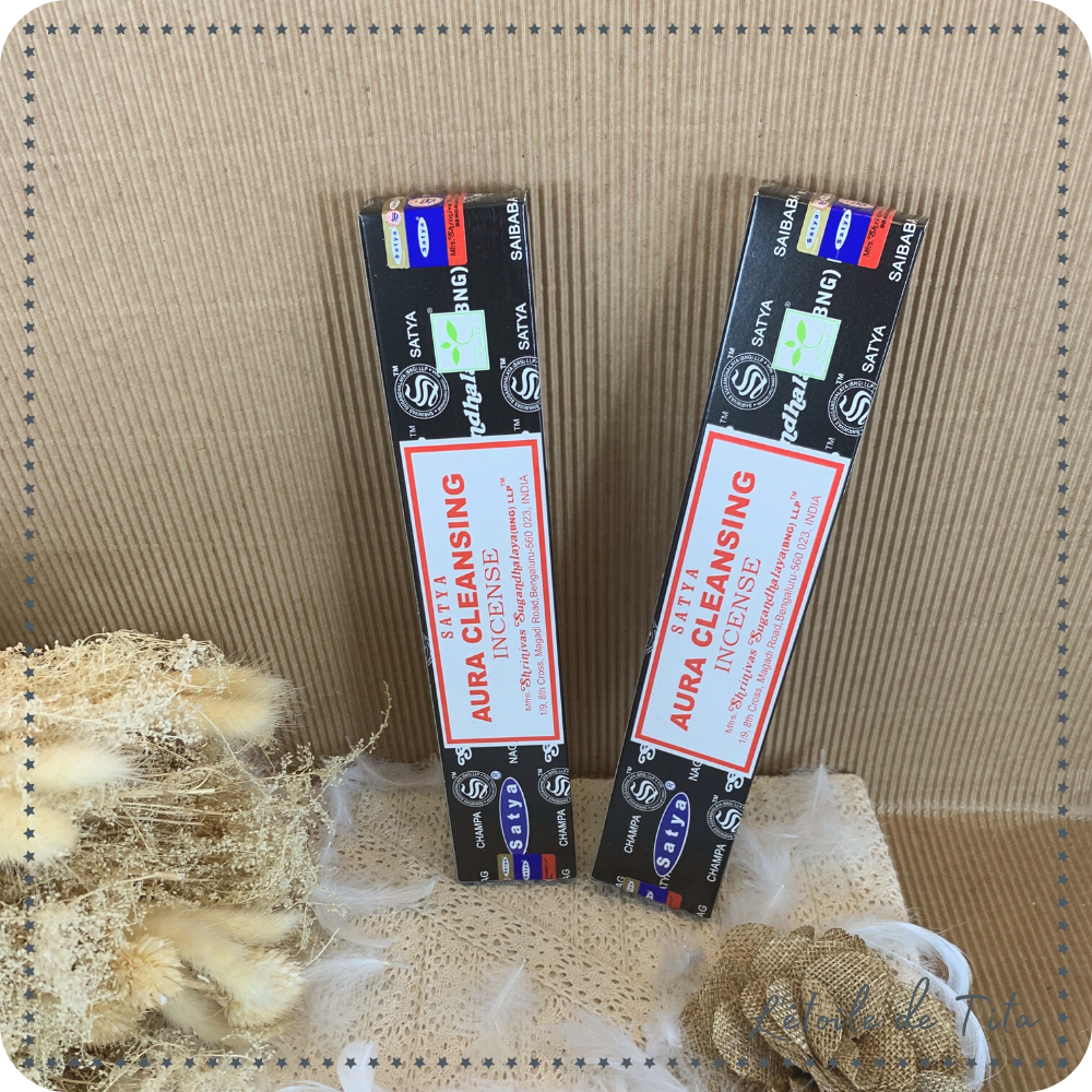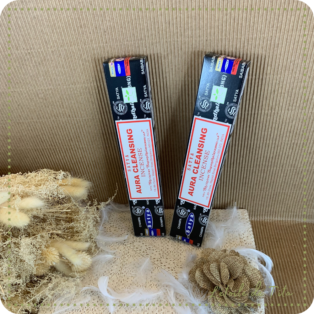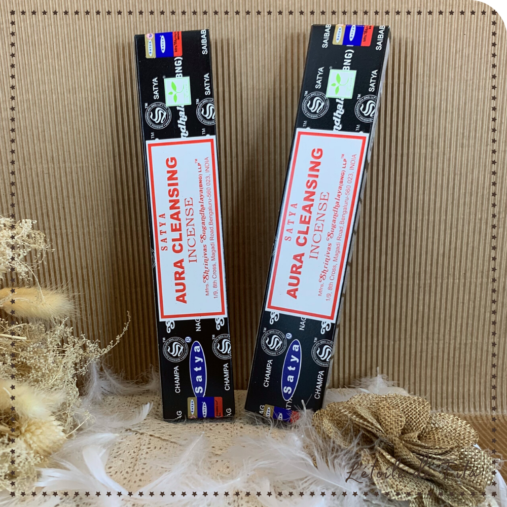 L'encens Aura cleansing de Satya est une nouvelle fragrance réalisée par le fabricant du célèbre encens Nag Champa. Allumer un bâton odorant d'encens Satya Aura cleansing pour qu'il diffuse son agréable fragrance subtile, aiderait à nettoyer et purifier votre Aura. L'aura c'est ce contour coloré, comme un « halo de lumière » qui rayonnerait autour du corps ou de la tête d'un être vivant et qui serait la manifestation d'un ou plusieurs « champs d'énergie » ou d'une force vitale.