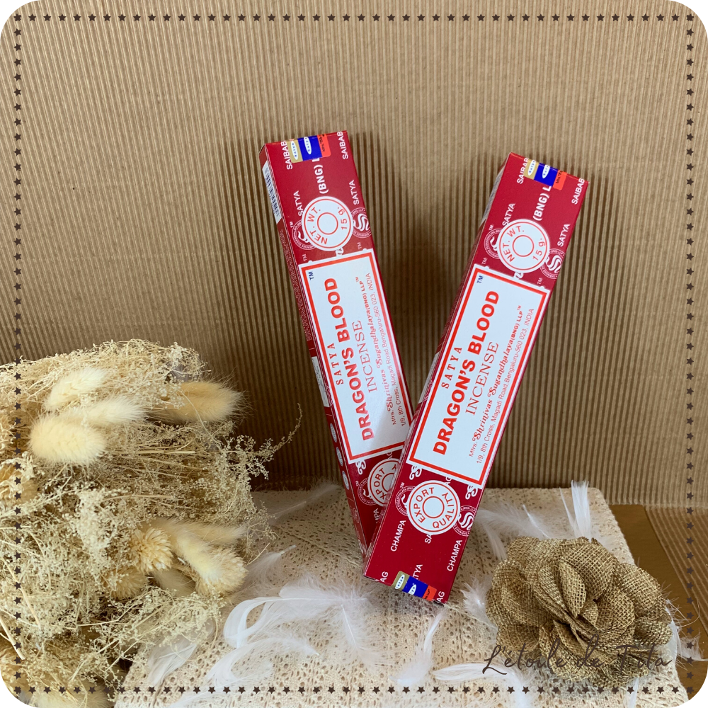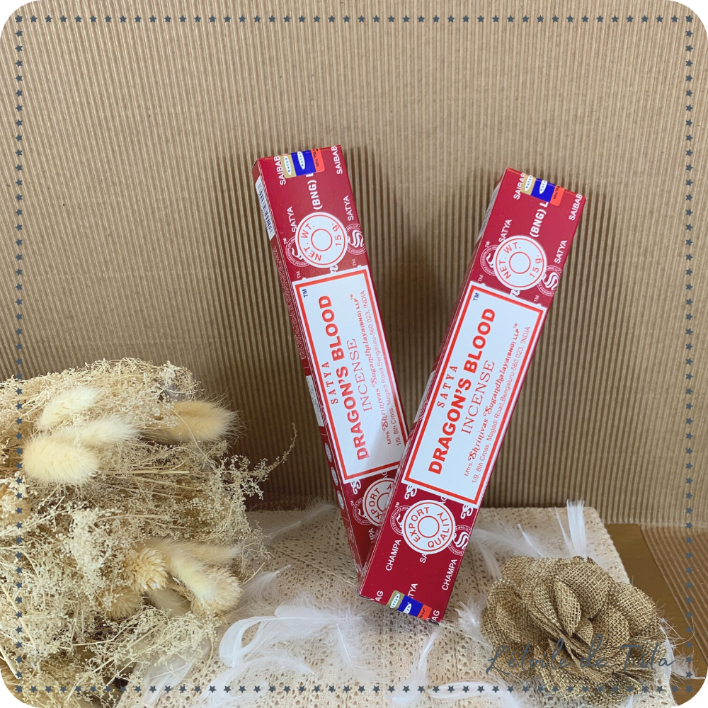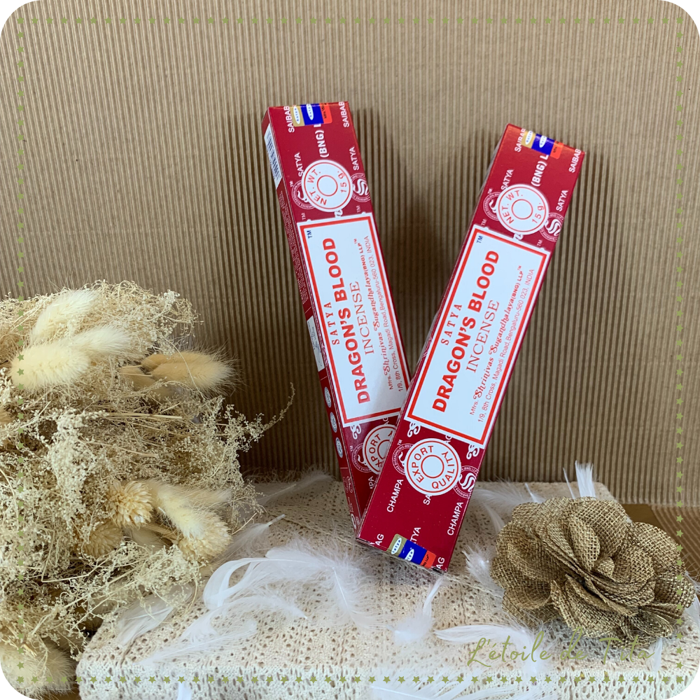 Le sang de dragon est une résine extraite d'un arbre originaire d'Asie, le dragonnier. Sa sève rouge fut baptisée sang de dragon. Elle possèderai de nombreuses vertus thérapeutiques (antiseptiques, cicatrisantes) Et sa fumée a un effet purificateur puissant.