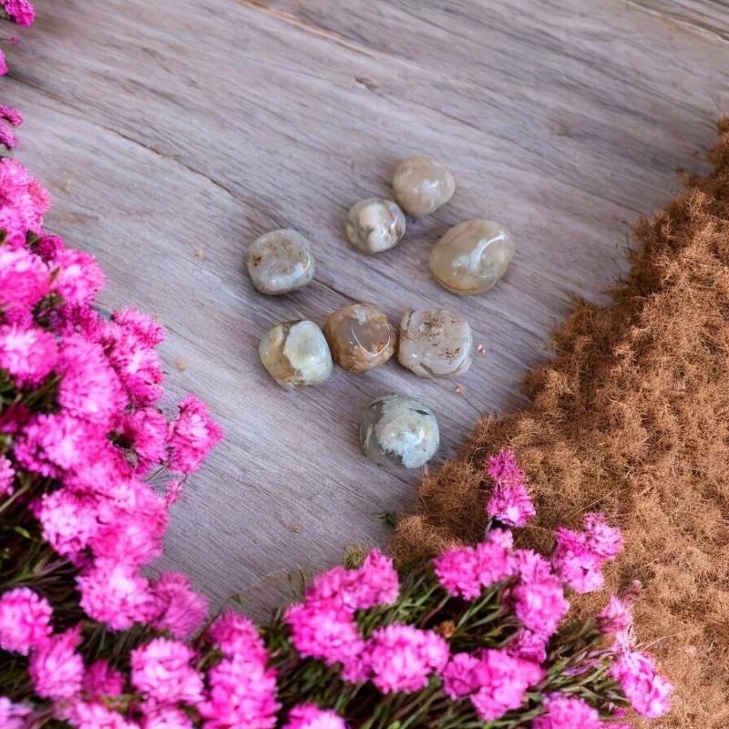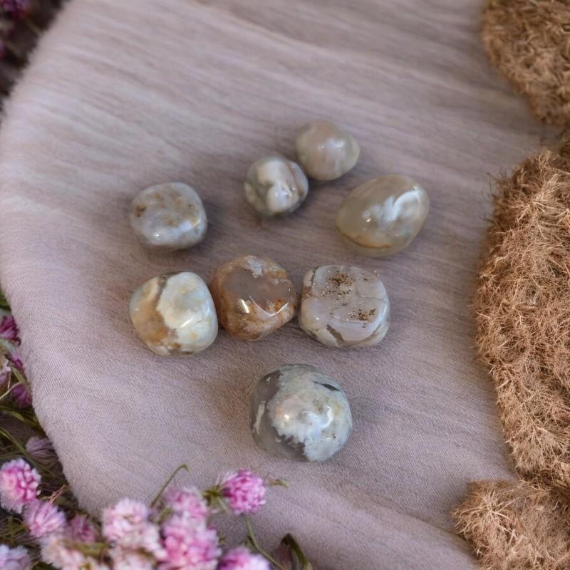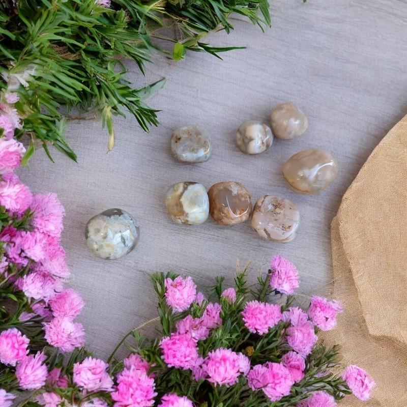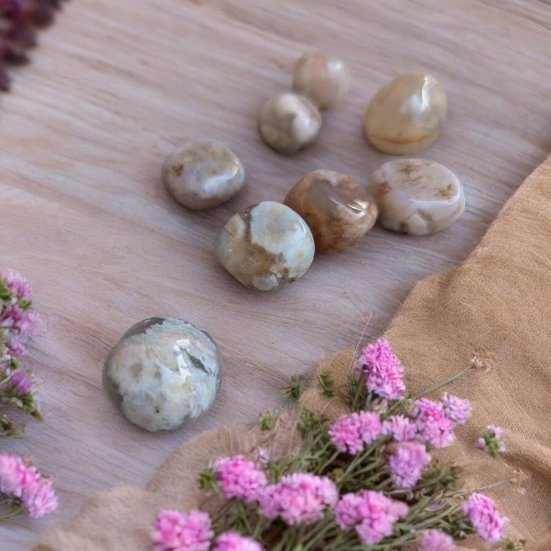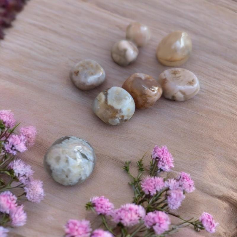 L’agate fleur de cerisier est une pierre rare et enchanteresse, évoquant la délicatesse des pétales emportés par le vent au printemps. Par ses inclusions naturelles rappelant de petites fleurs figées dans la pierre, elle symbolise la renaissance, la beauté éphémère de la vie et l’ouverture du cœur à la douceur.