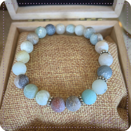 Un bracelet minimaliste et raffiné, composé de 21 perles d’Amazonite naturelle de 8 mm, sans pampille, montées sur cordon élastique discret.
