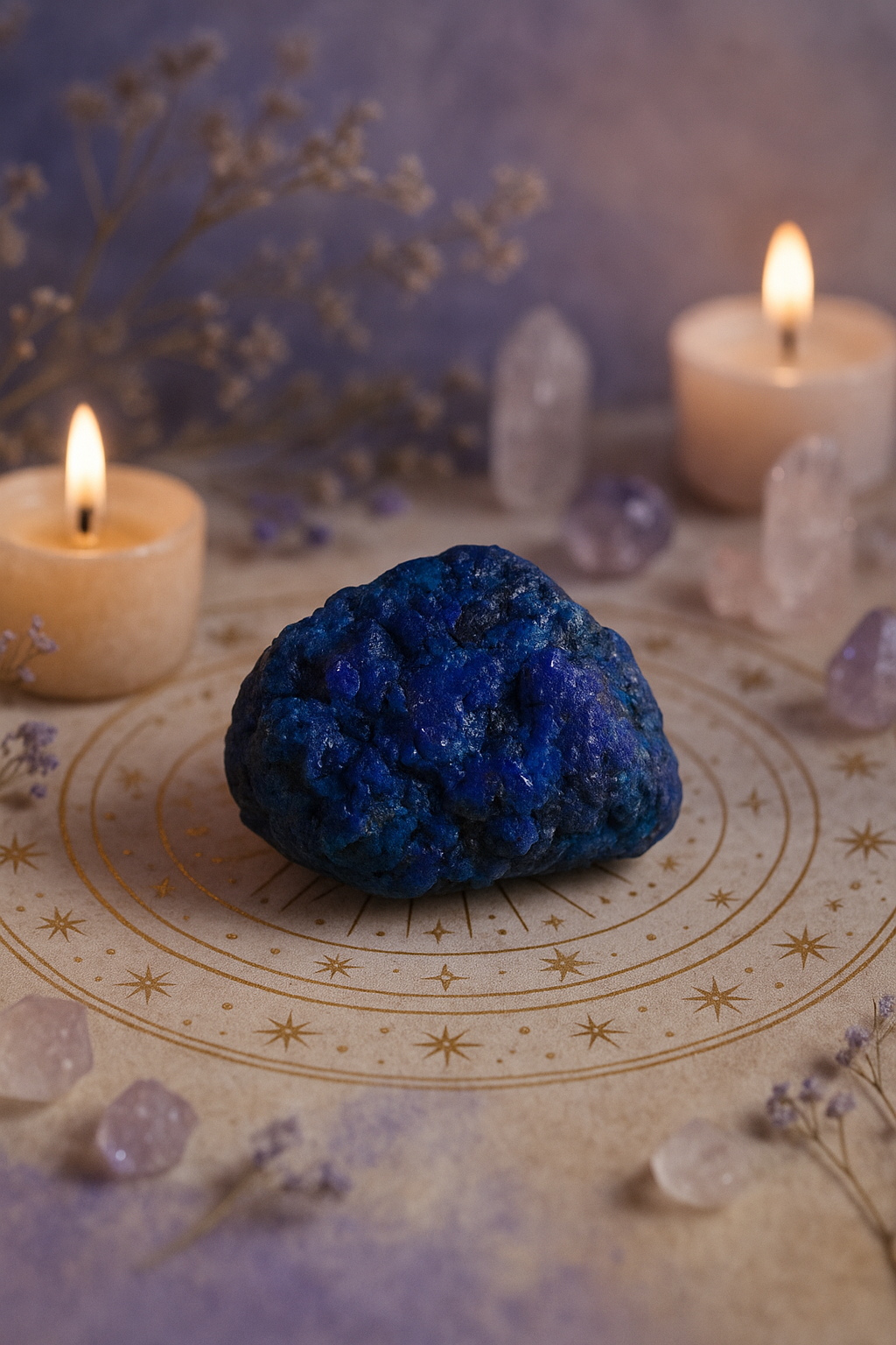 Azurite – Éveil, vision intérieure & sagesse mystique . L’azurite est une pierre d’intuition, de clarté mentale et de connexion spirituelle. Elle active le troisième œil, favorise la méditation, la voyance et la guidance intérieure. En lithothérapie, elle apaise les blocages mentaux, éclaire les pensées et soutient les transformations profondes. Utilisée en rituel ou en méditation, elle ouvre la conscience aux plans subtils. Une pierre sacrée pour les âmes en quête de vérité.