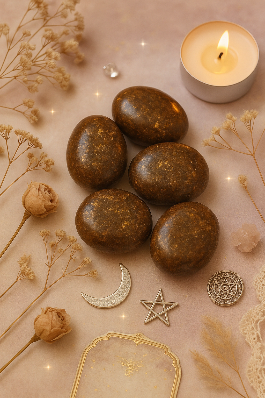 Pierres polies en bronzite – Force intérieure & ancrage protecteur : La bronzite est une pierre d’enracinement et de stabilité. Polie avec soin, elle révèle ses reflets dorés et son énergie apaisante. Idéale pour retrouver calme, courage et clarté dans les moments de tension. Elle agit comme un bouclier doux, ramenant équilibre et confiance en soi. Un compagnon précieux à glisser dans la poche, sur l’autel ou à utiliser en rituel.