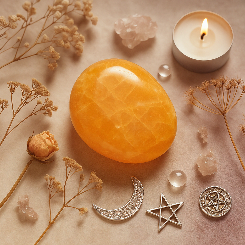 Calcite orange – Lumière, joie & énergie sacrée: Chaleureuse et solaire, la calcite orange réveille la créativité, la vitalité et la joie de vivre. Reliée au chakra sacré, elle apaise les émotions tout en stimulant l’élan intérieur. En magie, elle est utilisée pour attirer l’abondance, soutenir les rituels de transformation et enflammer la lumière intérieure avec douceur.