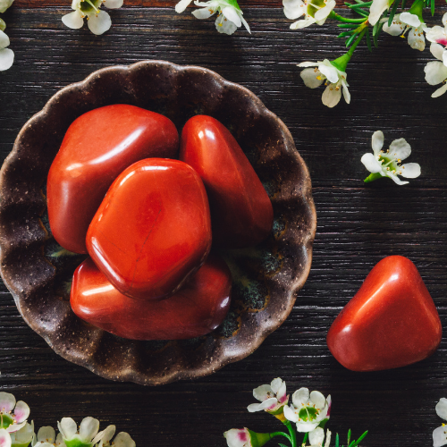 Le jaspe rouge : Il possède une importante énergie, notamment sur la sexualité féminine (apaisement des douleurs, stimulation des organes). Il permet au transit de mieux fonctionner en agissant directement sur le foie, le pancréas, la rate et l’estomac. Il peut être porté également par des personnes sujettes aux crises nerveuses.