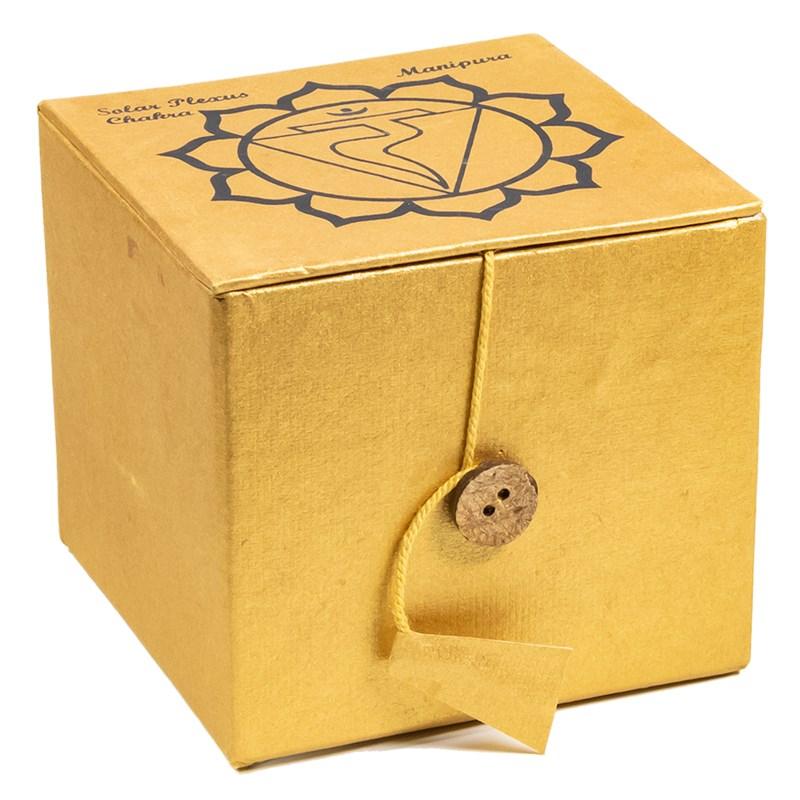 Bol chantant COULEUR CHAKRA plexus solaire, livré avec un bâtonnet et un coussin. dans une jolie boîte-cadeau en carton contenant des informations sur les 7 chakras. Fabriqué en Inde peinture sans plomb