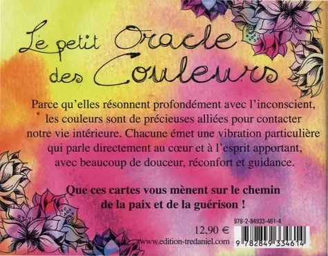 Parce qu’elles résonnent profondément avec l’inconscient, les couleurs sont de précieuses alliées pour contacter notre vie intérieure. Chacune émet une vibration particulière qui parle directement au cœur et à l’esprit apportant, avec beaucoup de douceur, réconfort et guidance. Que ces cartes vous mènent sur le chemin de la paix et de la guérison ! Comment utiliser les cartes ? Il vous suffit de placer votre main gauche au-dessus du jeu, de fermer les yeux et de penser à une question ou à une situation qui vous préoccupe. Choisissez une carte intuitivement puis laissez la couleur et le message vous inspirer…