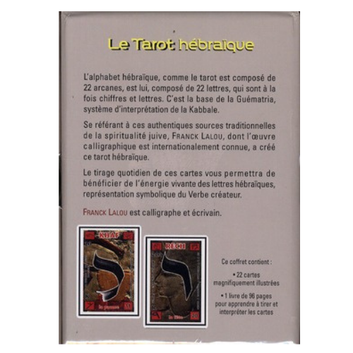 L'énergie vivante du Verbe créateur L'alphabet hébraïque, comme le tarot est composé de 22 arcanes, est lui, composé de 22 lettres, qui sont à la fois chiffres et lettres. C'est la base de la Guématria, système d'interprétation de la Kabbale. Se référant à ces authentiques sources traditionnelles de la spiritualité juive, Franck Lalou, dont l'oeuvre calligraphique est internationalement connue, a créé ce tarot hébraïque. Le tirage quotidien de ces cartes vous permettra de bénéficier de l'énergie vivante des lettres hébraïques, représentation symbolique du Verbe créateur.